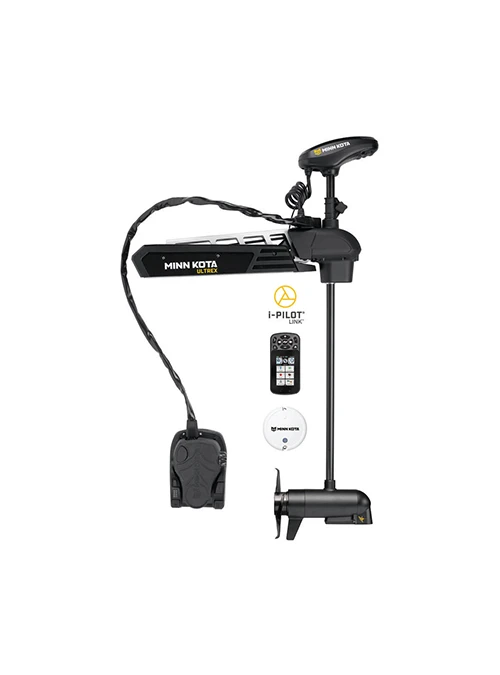 - What’s included: Ultrex motor with Built-In MEGA Down Imaging, i-Pilot Link Remote, Remote Charging Cable, USB DC Adapter, Lanyard, Heading Sensor, 30′ Ethernet Extension Cable, Stablizer, Hold Down Strap, MKP-38 Prop and Mounting Hardware.