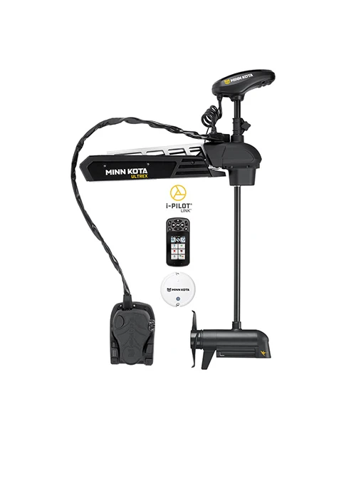 - What’s included: Ultrex motor with Built-In MEGA Side and Down Imaging, i-Pilot Link Remote, Remote Charging Cable, USB DC Adapter, Lanyard, Heading Sensor, 30′ Ethernet Extension Cable, Stablizer, Hold Down Strap, MKP-38 Prop and Mounting Hardware.
