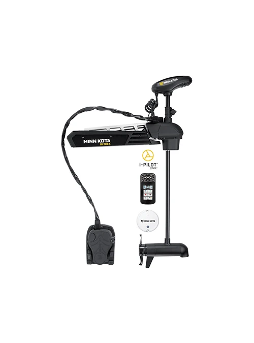 - What’s included: Ultrex motor with Built-In MEGA Down Imaging, i-Pilot Link Remote, Remote Charging Cable, USB DC Adapter, Lanyard, Heading Sensor, 30′ Ethernet Extension Cable, Stablizer, Hold Down Strap, MKP-33 Prop and Mounting Hardware.
