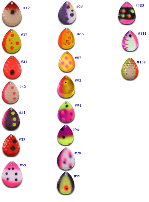 The Warrior Lures Colorado Blades are great Warrior Lures Panfish, Bass as well as Walleye fishing blades. The Colorado blades are deep cone cut hammered blades. All fishing blades are hand paint to exact standards.